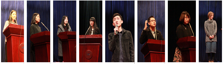 在学术方面,分别对学术论文、翻译应用、扎实英语基本功方面有突出表现的个人进行表彰。这是一个令人瞩目的群体,他们的学术成果如繁星璀璨。面对学术,他们有着锲而不舍的执着,有着精益求精的追求;面对困难,他们有着“日破云涛万里红”的自信,有着“泰山崩于前而不动”的坚强。获得学术论坛优秀论文一等奖的牛晨熹同学、韩素音英语翻译大赛获得二等奖的陈圆圆同学、以及在专四考试中刷新外院历史最高分的李明珠同学,分别上台领奖,并分享了个人的学习成长历程。