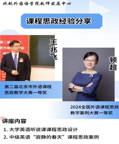 王兆飞是公共英语写作教学团队的教师,具有多年大学英语的教学经验。他此次分享的课程是北航校级一流课程《大学英语》B级二年级的听说课“The World at War”。他从授课材料的选择、教学目的、教学理念、授课步骤和课程评价五个方面介绍了该课的设计,尤其详细地介绍了课程思政元素的凝练及与语言教学有机融入的过程。他还为大家展示了其中十分钟的辩论教学。他根据员工的具体语言水平,设计了看视频填空、学习辩论常用句型、以及运用这些句型完善论证过程等互动环节,引导员工深入讨论战争与和平的辩证关系。