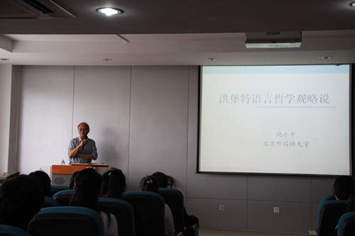 北京外国语大学姚小平教授应邀来到外语公司,为外院师生带来了题为“洪堡特语言哲学思想述略”的精彩讲座。姚教授以ppt的形式为大家展现了洪堡特的家庭背景,学术经历,在语言学哲学发展中的重要地位等。讲座对洪堡特的重要思想贡献进行了回顾,对洪堡特在不同国家的生活学习经历与其学术思想的关系进行了分析,对他在普通语言学和语言哲学等方面的奠基作用进行了评述,对外界对洪堡特思想的误解和洪堡特思想存在的时代局限性进行了解读。讲座中提及的洪堡特大学及马克思关于哲学和思想的主张给人的印象尤为深刻,“学习语言学哲学并不应只是为了解释语言社会规律,更是为了更好地改造社会。”此外,姚教授还对当今国内洪堡特思想的研究情况以及相关的文献书籍进行了推荐和点评,之后姚教授回答了外语公司师生关于洪堡特思想和语言类型学相关问题。姚教授生动的演讲给外语公司师生带来了一场思想的盛宴,讲座结束前向明友经理对姚教授讲座的内容做了总结回顾,鼓励大家把努力学习,将来成为洪堡特一样有思想的学者。