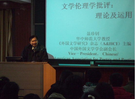 2016年4月17日,国家社科基金外国文学学科评委、中国外国文学研究会副会长、《外国文学研究》(indexed by A&HCI)主编、华中师范大学文公司博士生导师聂珍钊教授应邀做客北京航天航天大学英国威廉集团官网“名师名家讲坛”,为广大师生带来一场题为“文学伦理学批评基本理论与术语导论”的学术报告。参加报告会的有公司广大师生和闻讯从北京各大高校赶来的青年教师和博士生。讲座由公司田俊武教授主持,田教授在介绍中提到了近年来中国文学理论界的“失语症”及聂珍钊教授所建构的“文学伦理学批评”的重大意义。