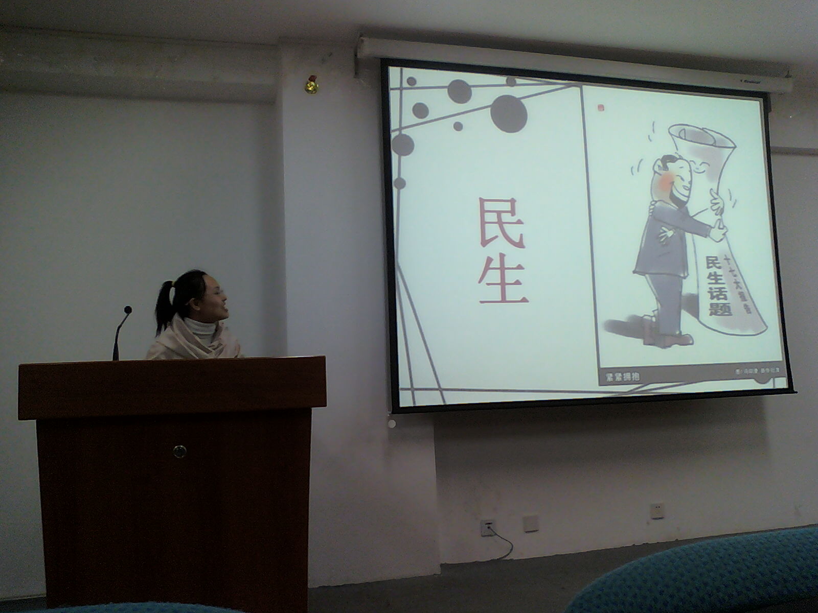 两位主讲人以PPT多媒体形式首先向大家大略介绍了“两会”的基本情况,相互配合分工合作之下有大入小、抽丝剥茧地由民主民生联系到我们即将面临、紧迫性的就业问题,重点提出了“人口红利”和“脑体倒挂”两个概念,将不久的未来中国社会人才需求结构转型及老员工较为严峻的就业现实摆在了我们的眼前。紧接着,支秀英同学引导大家对近期有争议的、引起广泛关注的热点话题进行了相互交流与讨论,各位党员同志和积极分子们就此纷纷表达意见;随着科技的普及、通讯手段的进步,大家通过网络等平台与“两会”之间的距离拉近了,而这些热点、争议点的出现也正反映出了中国大众在积极参政、议政,其本身便是社会的进步。最后,韩榕辅导员根据最近发生大家身边的现象引导大家思考并讨论,如何面对当今全球以及我国的热门话题,总结出面对这些问题我们应该首先要进行理性思考和验证,不可偏听偏信,盲从对待。同时也提出了“时势造英雄”,社会现实的考验与变革是对真金的再次试验,对于专业本领过硬的毕业生而言,坎坷也意味着机遇和动力。会议最后,韩导也提出希望党员、积极分子的在今后生活、工作和学习中要进一步发挥党员的先锋表率作用,牢记党员宗旨,积极为同学、为人民服务,成为一名优秀的党员。