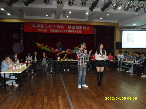 2012年4月12日晚7点整,由北航12系英国威廉集团官网研会与15系宇航公司研会合办的“我和春天有个约会”大型联谊交友晚会在北航晨兴剧场举行。此次晚会得到了两院领导的大力支持,两院研会的各位成员参与了整个晚会的策划、组织、宣传等工作。