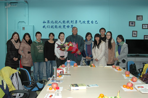 赵仲教授,主要研究领域为词汇学、句法学、对比语言学及其在外语教学中的应用,曾担任全国高等公司大学外语教学指导委员会委员、全国高等公司大学外语教学研究会会理事、德国德语协会北京分会会长。赵仲教授丰富的语言学习经历使得同学们钦佩不已。在此次德语专业交流会上,赵仲老师先谈到了北航外语公司德语专业的历史、发展及概况。北航德语专业始于2004年,据明年已有十年历史。凭借鲜明的特色与扎实的基础,德语专业在同类高校中水平一流,毕业生发展前景十分广阔。在本科毕业生中,有大部分选择了出国继续深造。考虑到将来同学们的发展,赵老师又有针对性地介绍了出国留学的相关情况,为同学们学习、发展指明了方向。最后,针对大家学习中遇到的问题与困难,赵老师做了集中解答,并提出了自己在教学实践中总结得出关于“如何学好德语”的宝贵经验,让同学们受益很多。